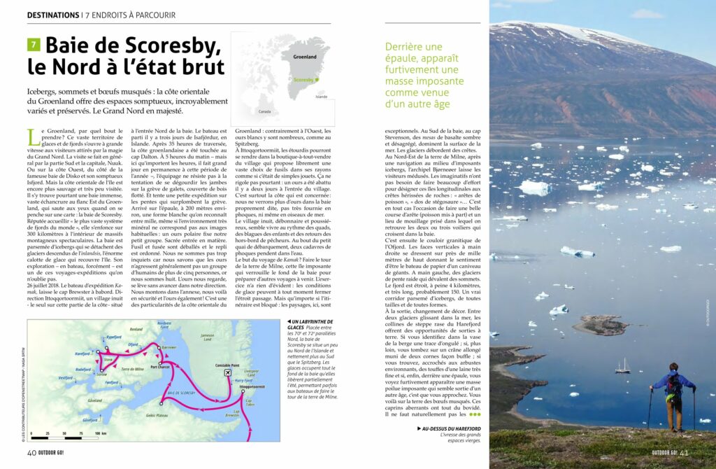 Cet article paru en décembre 2018 dans le numéro 15 du magazine OUTDOOR GO ! rend compte d’une expédition dans la baie de Scoresby, au Groenland, à bord de KAMAK en novembre 2019.