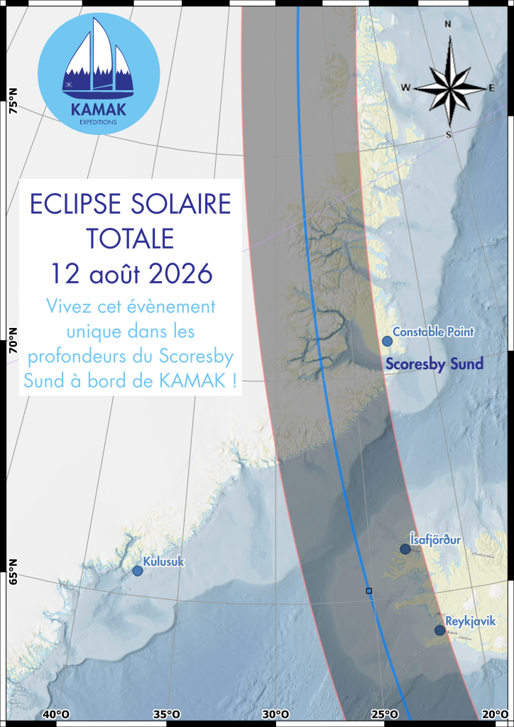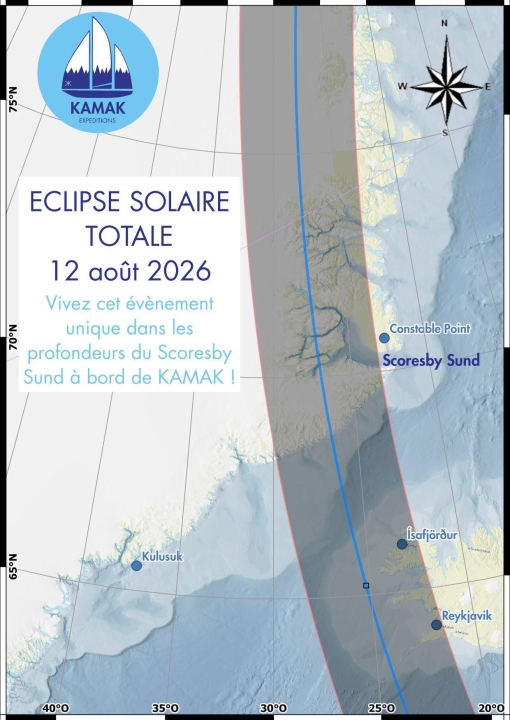 Point d’orgue : le 12 août 2026, KAMAK se tiendra au cœur même de la bande de totalité de l’éclipse totale de Soleil, prévue pour son pic vers 16h30 UTC dans le Rypefjord situé au fond du Scoresby.