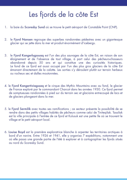 – Le Fjord Kangerlugssuaq est l’un des plus sauvages de la côte Est, en raison de son éloignement et de l’absence de tout village, à part celui des pêcheurs-chasseurs abandonné depuis 50 ans et qui constitue une des curiosités historiques ; le fond de ce fjord est aussi occupé par l’un des plus gros glaciers de la côte Est émanant directement de la calotte. Les sorties s’y déroulent plutôt sur terrain herbeux ou rocheux sec et dalles moutonnées.