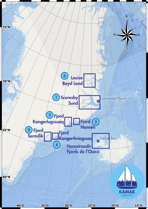 Au départ d’Ísafjörður en Islande, nous embarquerons sur KAMAK puis traverserons à pied en quelques heures, la péninsule sauvage de Hornstrandir, avant de ré-embarquer pour une navigation sous voiles de deux jours et deux nuits à travers le détroit du Danemark, jusqu’à l'entrée du fjord Scoresby.