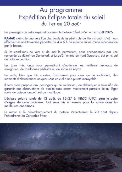 🌞 Éclipse totale du Soleil | Ísafjörður (Islande) | Constable Point (Groenland) | 1er – 20 août 2026 | 9 400 € |