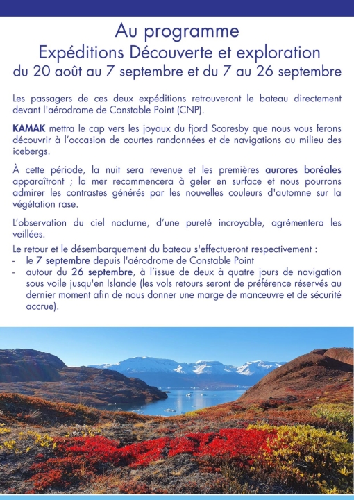 🌌 Exploration & astronomie | Constable Point (Groenland) | Ísafjörður / Reykjavik (Islande) | 7 – 26 septembre 2026 | 8 400 € |