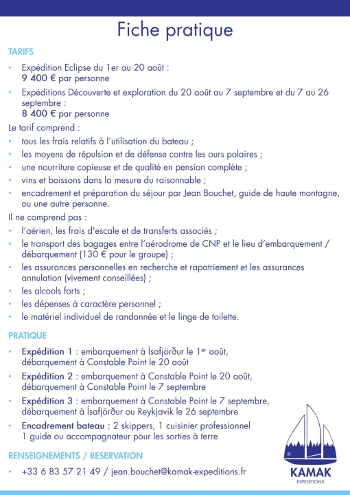Expédition | Embarquement | Débarquement | Dates | Prix / pers. |