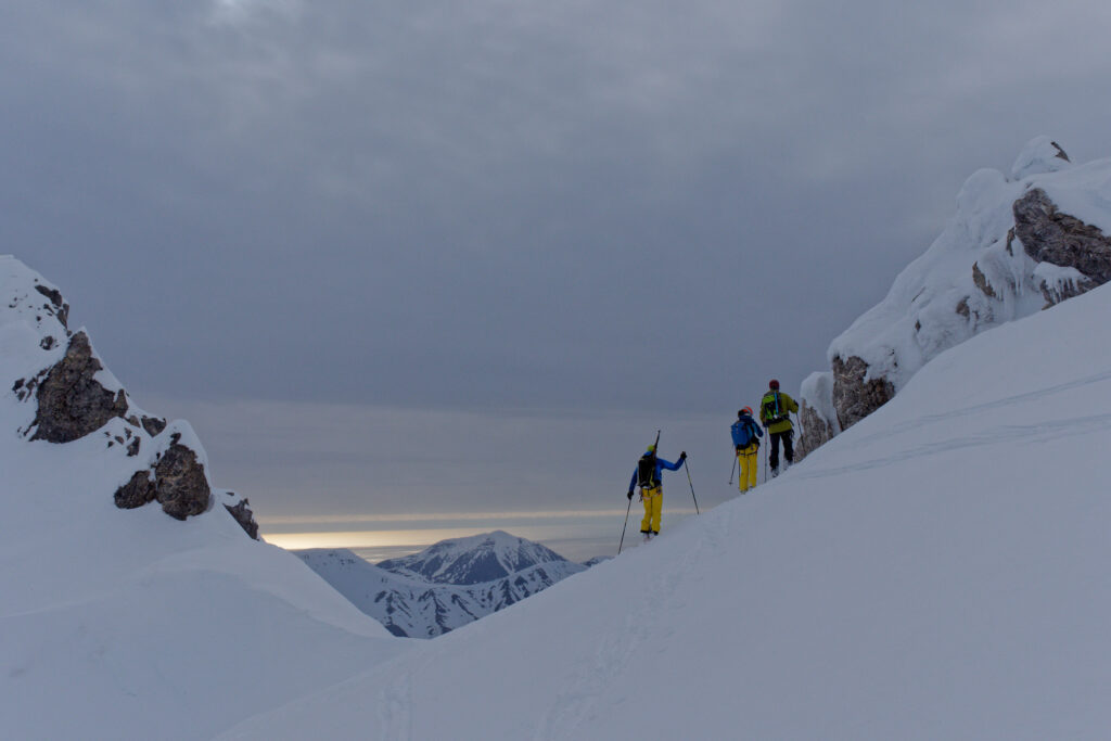 En février 2018, KAMAK peut enfin quitter Lorient et mettre le cap sur le Grand Nord. Ce sont les fjords norvégiens qui ouvrent le bal, dans les Alpes de Sunnmøre, puis dans le Finnmark, enchevêtrement d’îles bien moins fréquenté que les Alpes de Lyngen toutes proches. En mai, c’est le Spitzberg, terre des ours où l’étrave du navire vient tutoyer les 80° de latitude nord, avant de partir explorer les grands fjords du sud de l’île, injustement délaissé par la plupart des expéditions. Les grandes traversées y sont sublimes, et l’engagement marqué : immenses glaciers aux ponts de neige rongés par l’humidité marine et la température anormalement chaude de ce printemps, cartographie parfois dépassée par les brusques crues glaciaires ou, au contraire, un recul d’ampleur, imprévisibilité du vent et de la houle pouvant rendre les rembarquements scabreux voire impossibles, et pour finir la menace toujours présente du maître des lieux : l’ours polaire, celui que l’on ne voit presque jamais mais qui monopolise les pensées dès que l’on quitte les sommets escarpés pour revenir vers la grève… Du reste, les six kilos du vieux Mauser qui déséquilibre le sac et vrille le dos se font fort de rappeler la vigilance toujours de mise.