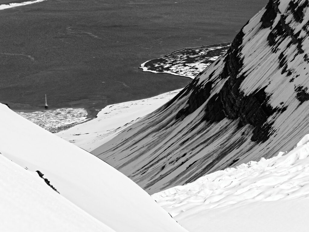 Il faut s’apprivoiser, intégrer les us et coutumes d’un nouvel univers, ne plus considérer l’orientation que simplement du point de vue nivologique (du reste assez uniforme sous le soleil de minuit), mais aussi en tenant compte du clapot que le vent pourrait bien lever dans le fjord, intégrer les contraintes de navigation en sus de celles, déjà bien assez nombreuses, à prendre en compte pour le sommet… Nouer, aussi, les meilleures relations avec les autres bateaux qui tournent sur zone : mis à part, là encore, quelques indélicats identifiés et connus de tous, c’est une grande confrérie bien semblable à celle des guides de nos vallées. Les cargaisons de salaisons diverse, Abondance, tomme de Savoie, gruyère et autre comté ne sont pas pour peu dans l’accueil bienveillant réservé par ces hommes de la mer à ces drôles d’olibrius sortis de leurs alpages.