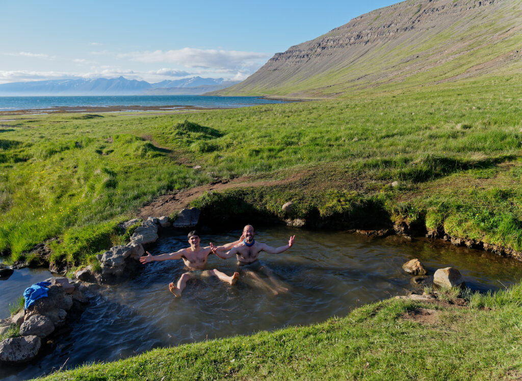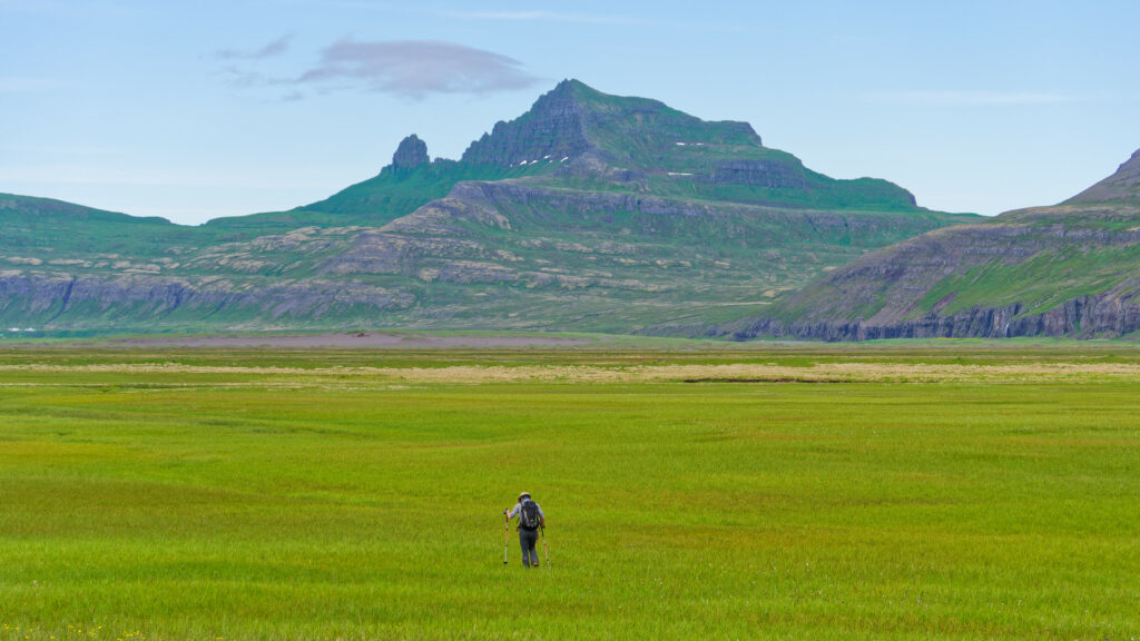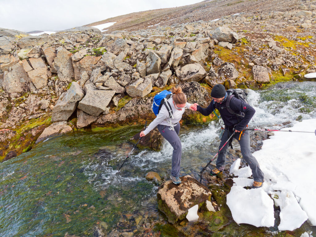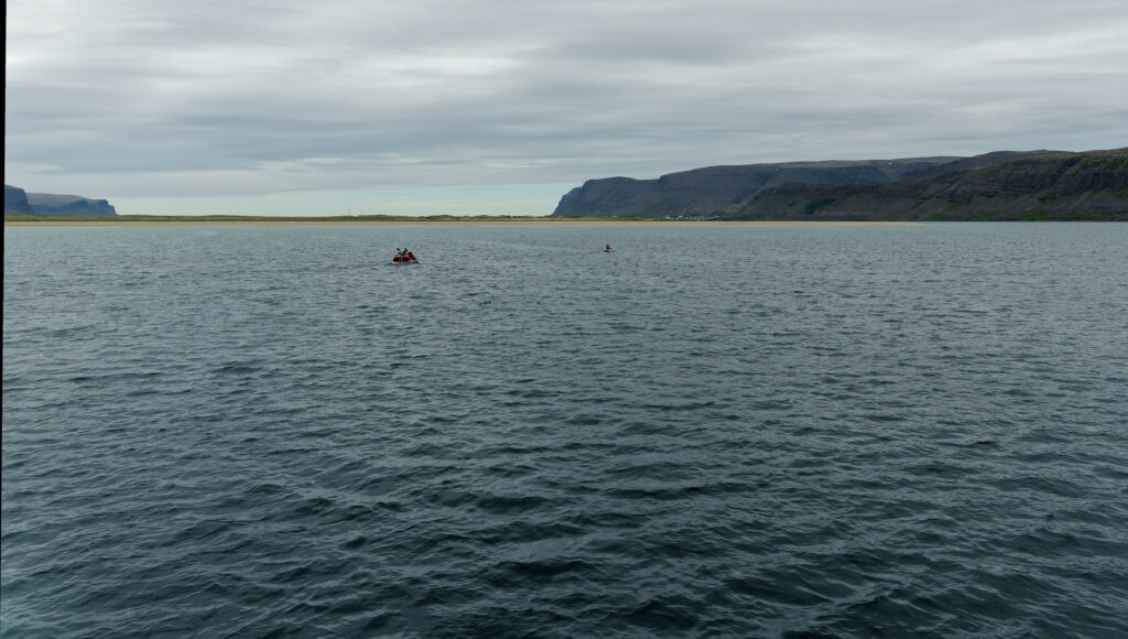 Après l’exaltante mais éreintante saison de ski, voici le retour de la verdure en Islande, dans les Fjords du Nord-Ouest et la péninsule du Hornstrandir aux falaises déchiquetées, habitées de nuées de goélands et de guillemots tâchant de garder leurs œufs à l’abri des renards polaires qui ont trouvé refuge dans cette réserve. C’est le temps du kayak de mer, de la pêche à la morue, des randonnées à pied couronnées de bains dans une source chaude sourdant dans un petit bassin creusé dans la prairie, au fond d’un fjord baigné par la lumière d’un soir d’été qui refuse de finir. En plissant l’œil, on devine sur la ligne d’horizon une tâche plus claire : c’est un émissaire flottant du Groenland, si proche par-delà le détroit de Danemark. L’appel des glaces retentit à nouveau, et KAMAK retrouve icebergs et bourguignons dans le Scoresby Sund pour le mois d’août. L’été fini, il faudra bien rentrer, mais par le chemin des écoliers :  les Féroé, l’Écosse…