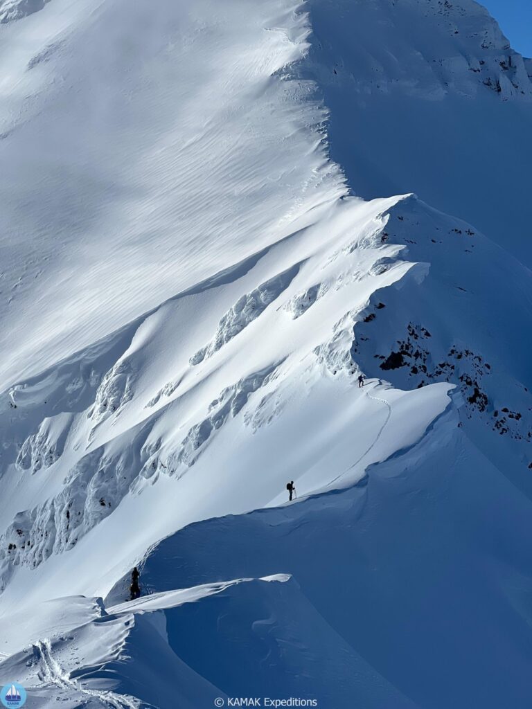Le vent est modéré mais il y a souvent des vents catabatiques qui descendent des plateaux enneigés et des glaciers, et l’incidence de l’orientation des fjords et du relief montagneux est importante. Certaines montagnes peuvent ainsi former de bons abris contre le vent, et on trouvera une meilleure neige pour le ski de randonnée sur les faces abritées.Mais un élément qui caractérise la période du ski de randonnée au Spitzberg, c’est le jour permanent ! Même à minuit, le soleil reste suffisamment haut dans le ciel pour qu’il fasse aussi clair qu’en plein jour, seul son intensité sera un peu moindre. Ainsi, on peut tout à fait planifier une sortie de ski de randonnée au Spitzberg à 22h ou 4h du matin ! L’hiver, la nuit polaire dure plus de trois mois.